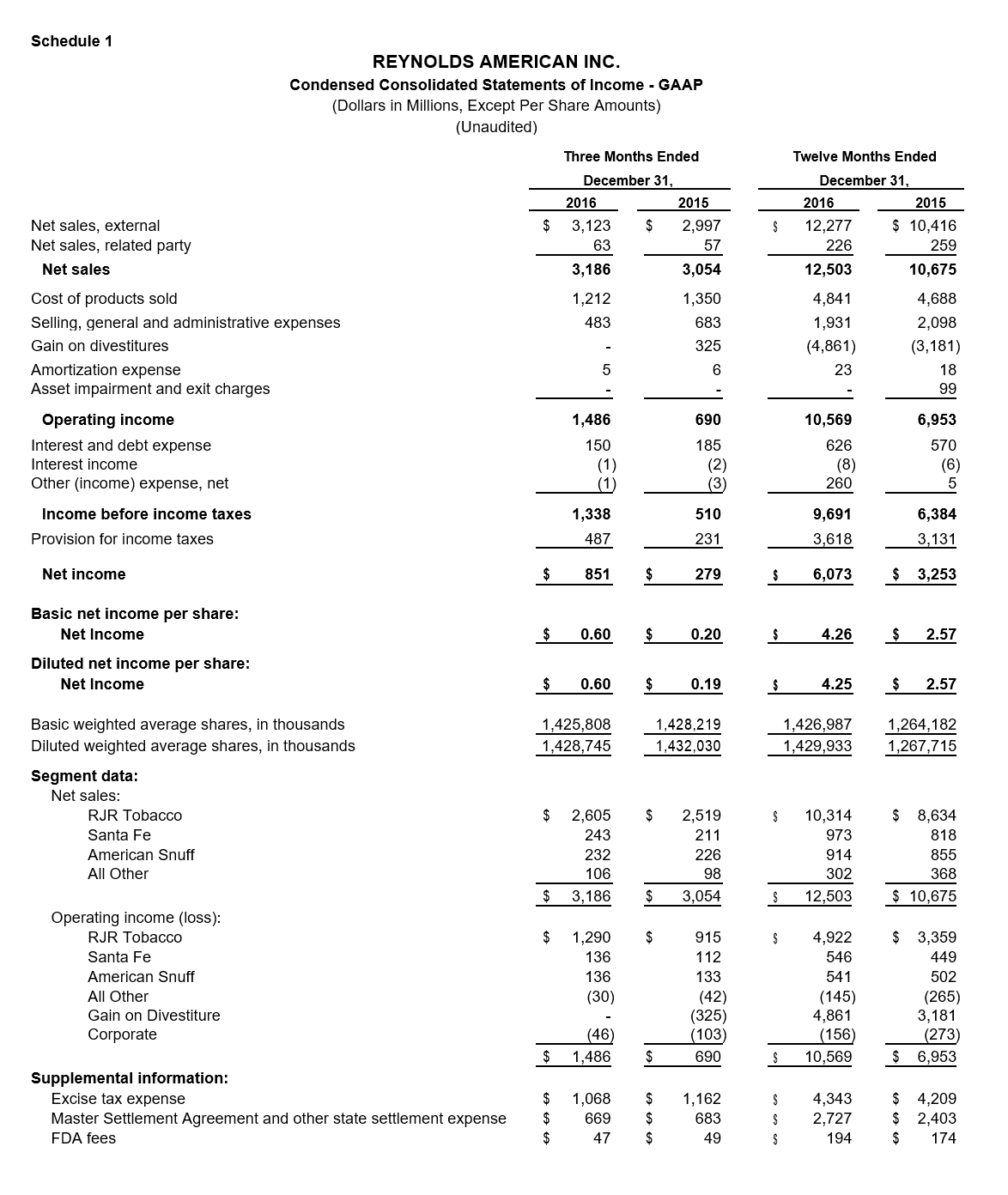 “I’m pleased to report that Reynolds American concluded another milestone year with strong growth in fourth-quarter earnings and margin,” said Debra A. Crew, president and chief executive officer of RAI. “Our companies’ continued delivery of excellent operating performance, including the impact of Newport’s successful integration, allowed us to accelerate returns to our shareholders in 2016.”