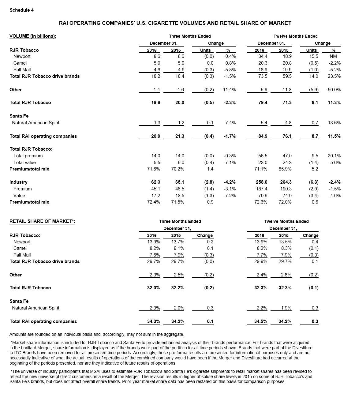 Total fourth-quarter domestic cigarette volumes for RAI’s operating companies decreased 1.7 percent from the prior-year quarter, and increased 11.5 percent for the full year versus 2015. Comparisons for the full year were driven largely by the addition of the Newport brand in June 2015.